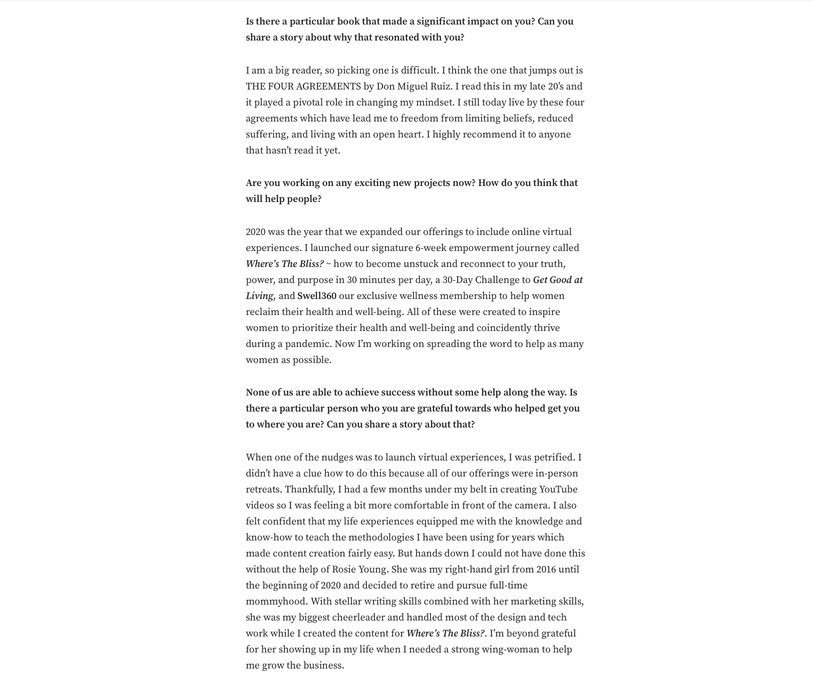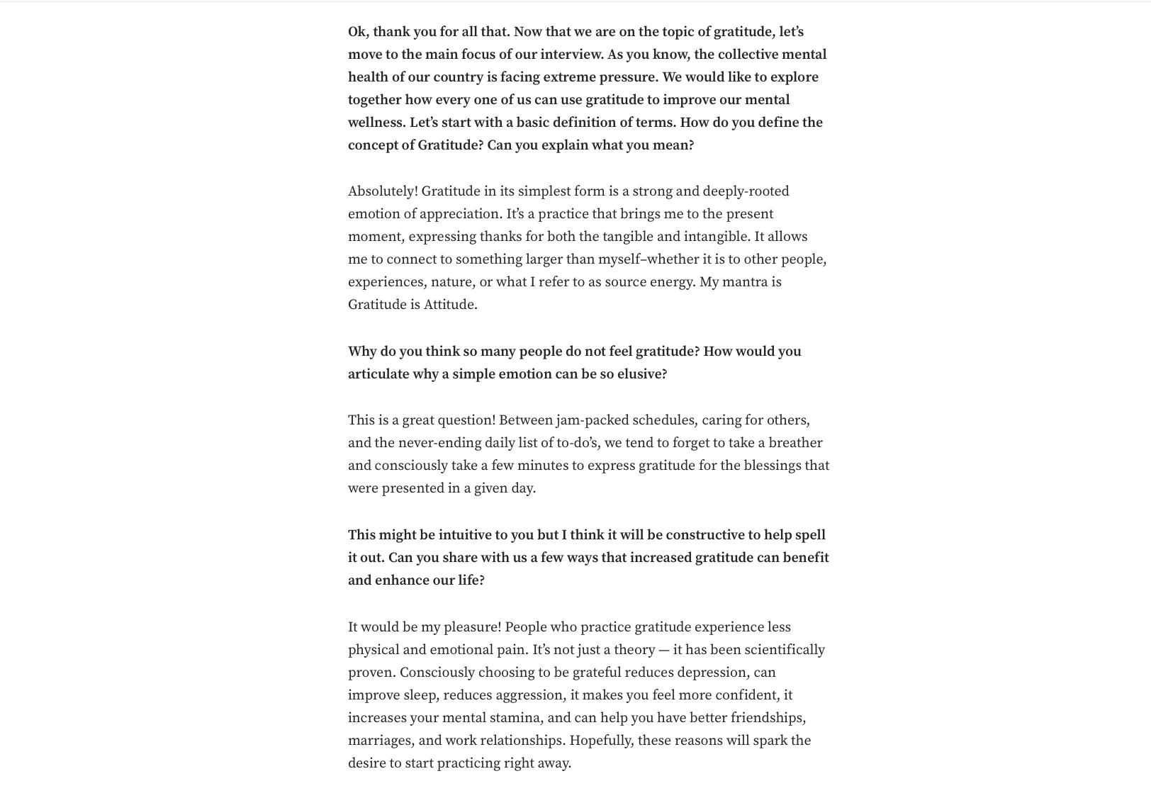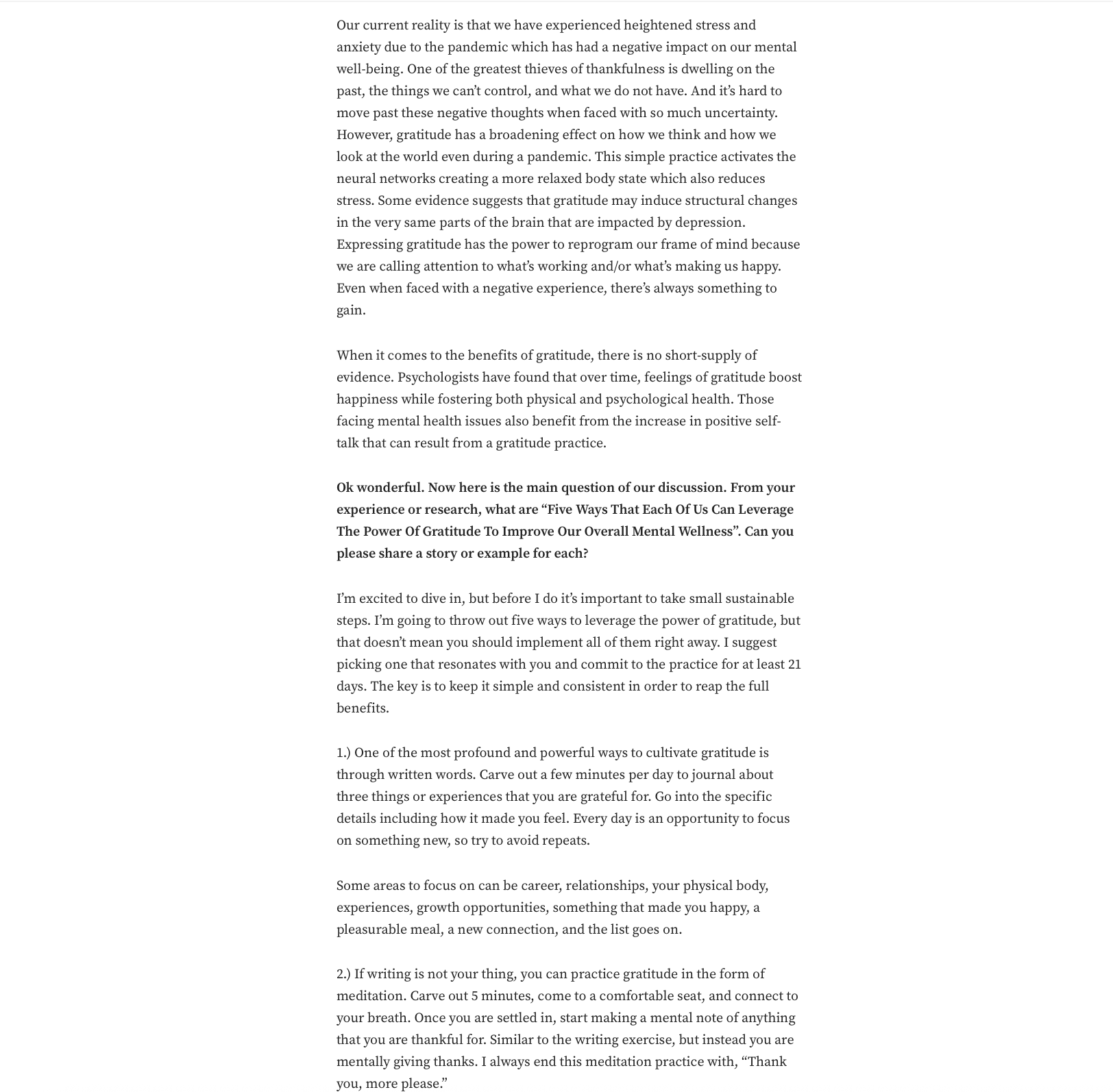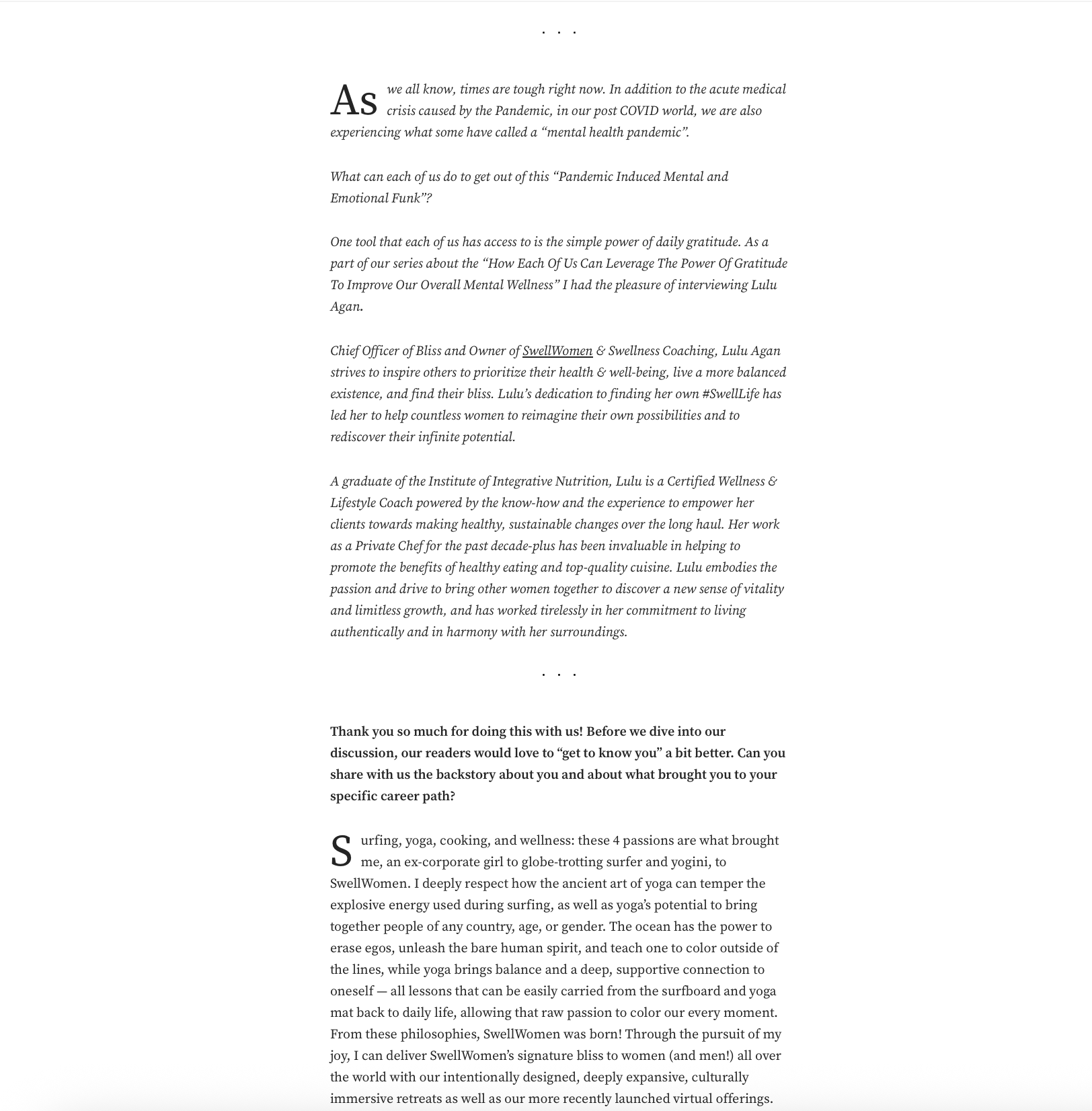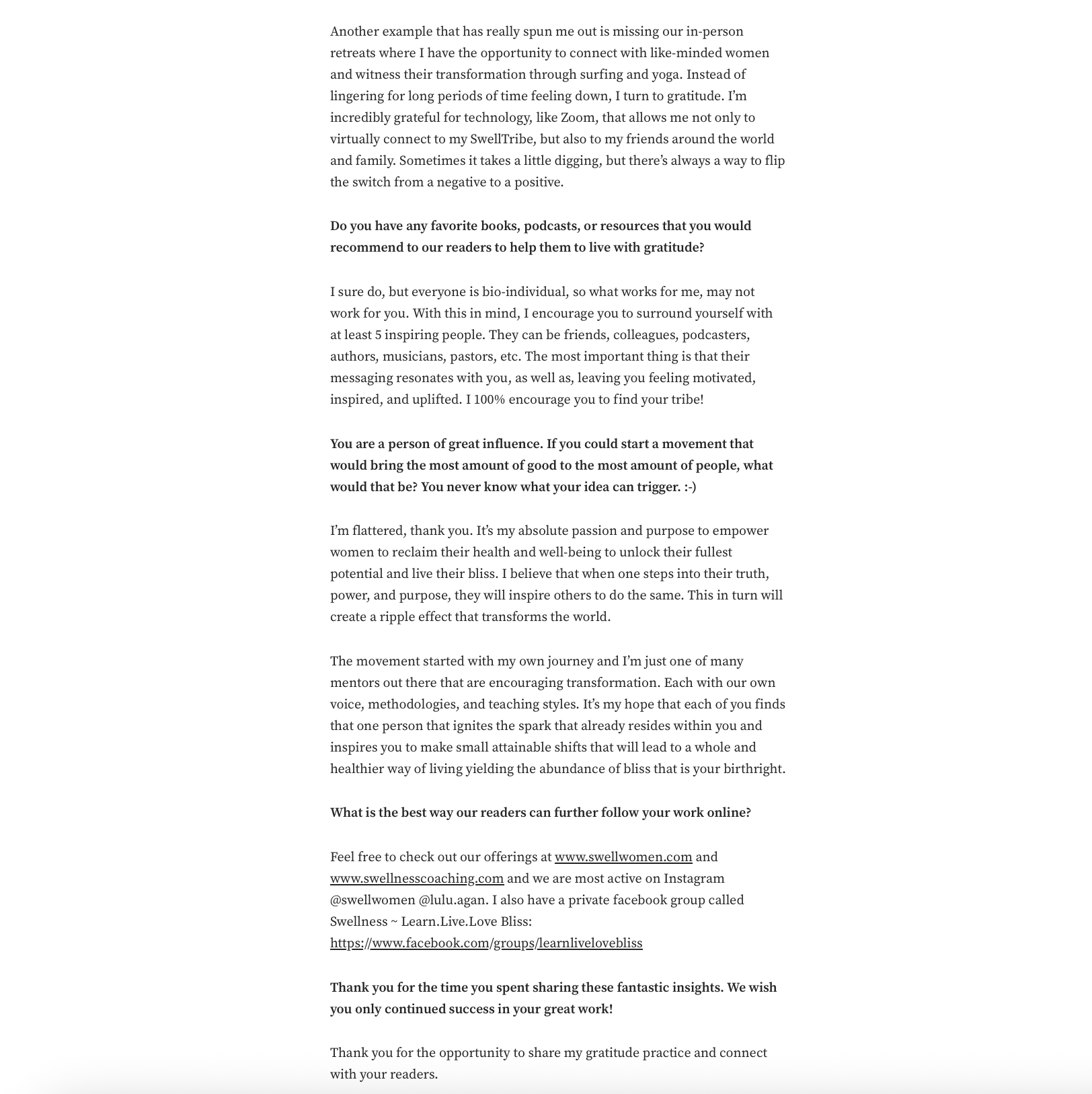 Back in 2021, Chief Officer of Bliss, Lulu Agan was featured in Authority Magazine, where she shared insights on how we can leverage the power of gratitude to support and elevate our overall mental wellness. The conversation highlighted simple yet impactful practices that help cultivate more presence, resilience, and connection in everyday life.